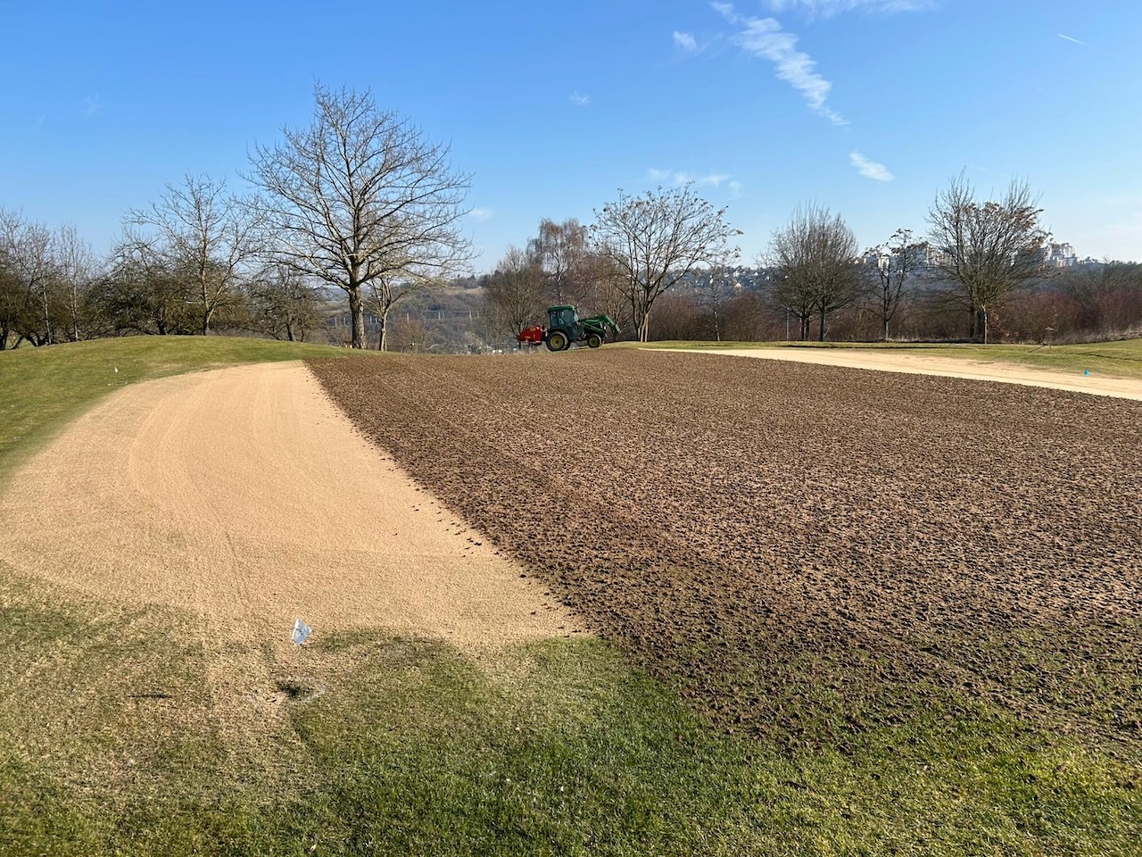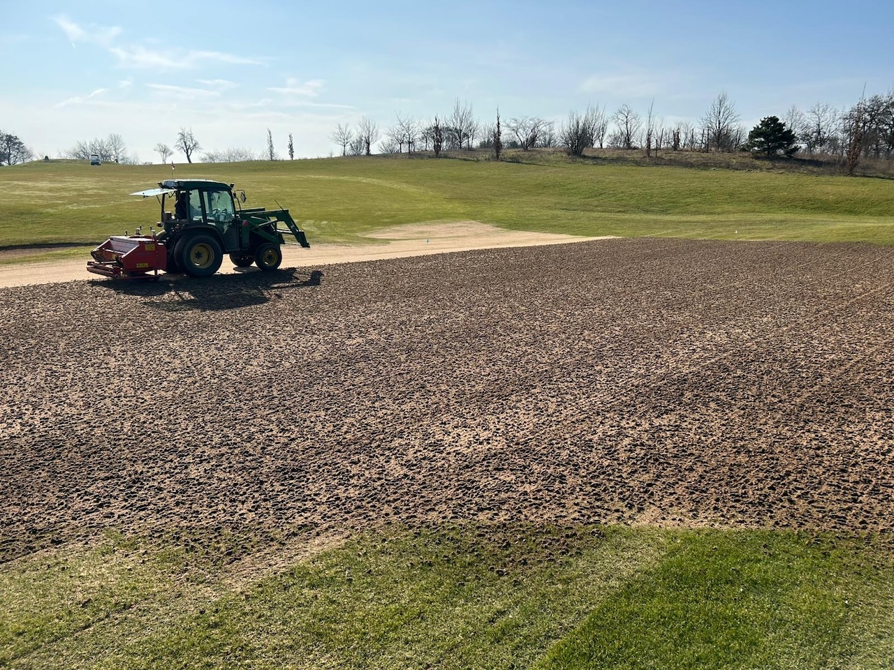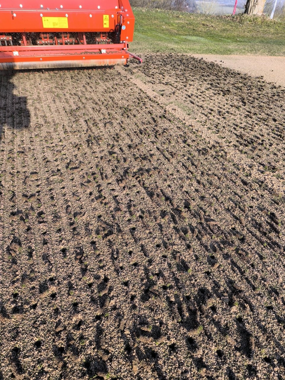 Anschließend werden die Grüns gesandet und eingekehrt. Das heißt, die entstandenen Löcher werden mit Sand aufgefüllt, um sie so als kleine Luftdrainagen zu erhalten und den Anteil an organischem Material in der Rasentragschicht zu reduzieren. Außerdem sorgt der zusätzliche, oben aufliegende und in die Grasnarbe eingekehrte Sand langfristig für eine ebene und gleichmäßigere Puttoberfläche.