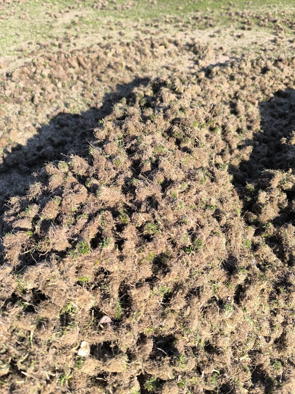 Dazu werden mit dem Aerifizierer viele kleine Löcher in die Grüns gestochen und durch den Einsatz sogenannter Hohlspoons viel organisches Material wie abgestorbene Wurzeln, Rasenfilz etc. aus der Rasentragschicht entfernt.