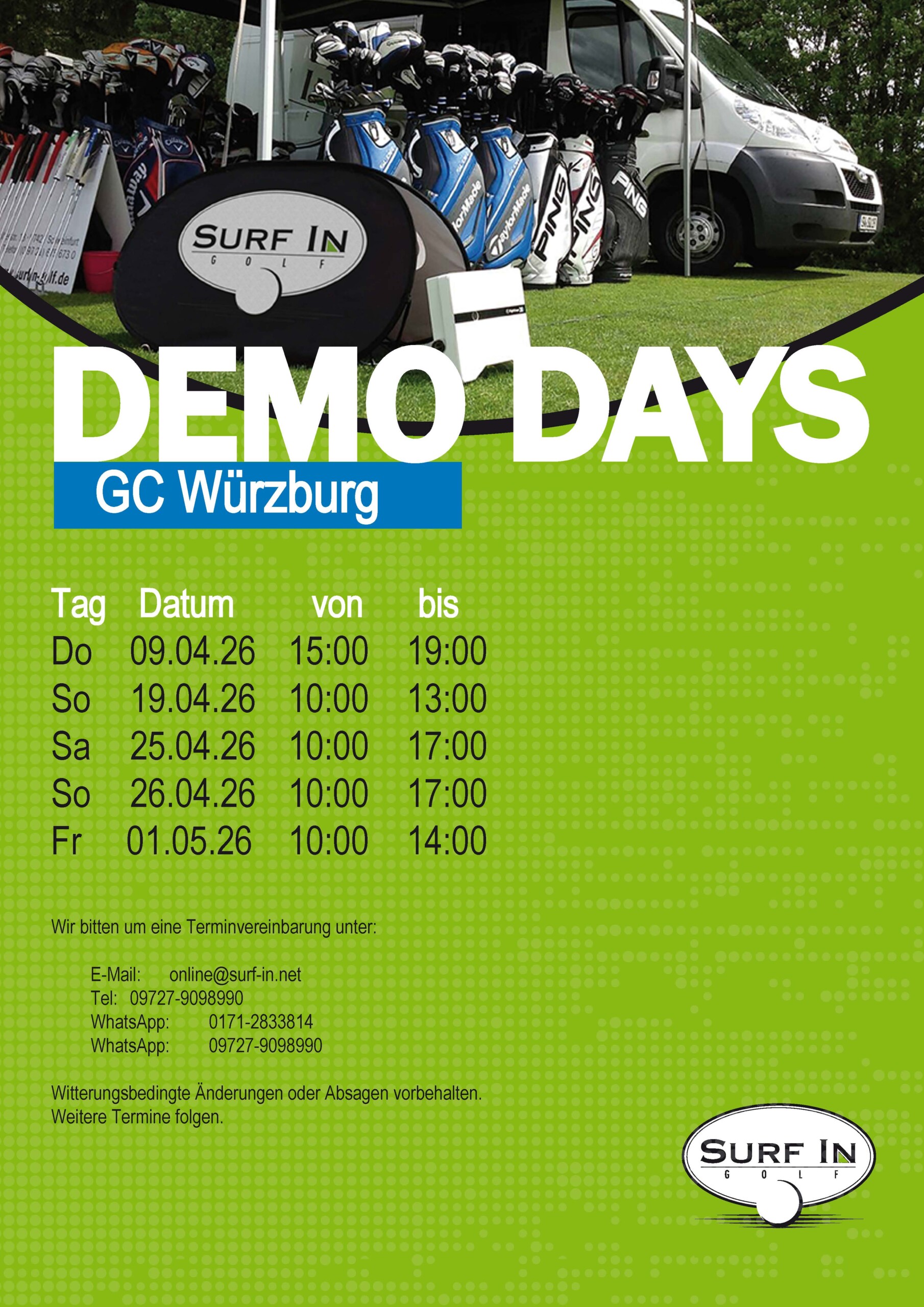 Freuen Sie sich auf die exklusiven Demo Days unseres Partners Surf In. Nutzen Sie die Möglichkeit, beim „Fitting Profi“ Frank Schubert eine individuelle Schlägeranpassung zu erhalten. Unsere Termine im April und Mai 2026 bieten Ihnen die ideale Gelegenheit, sich ausführlich beraten zu lassen.