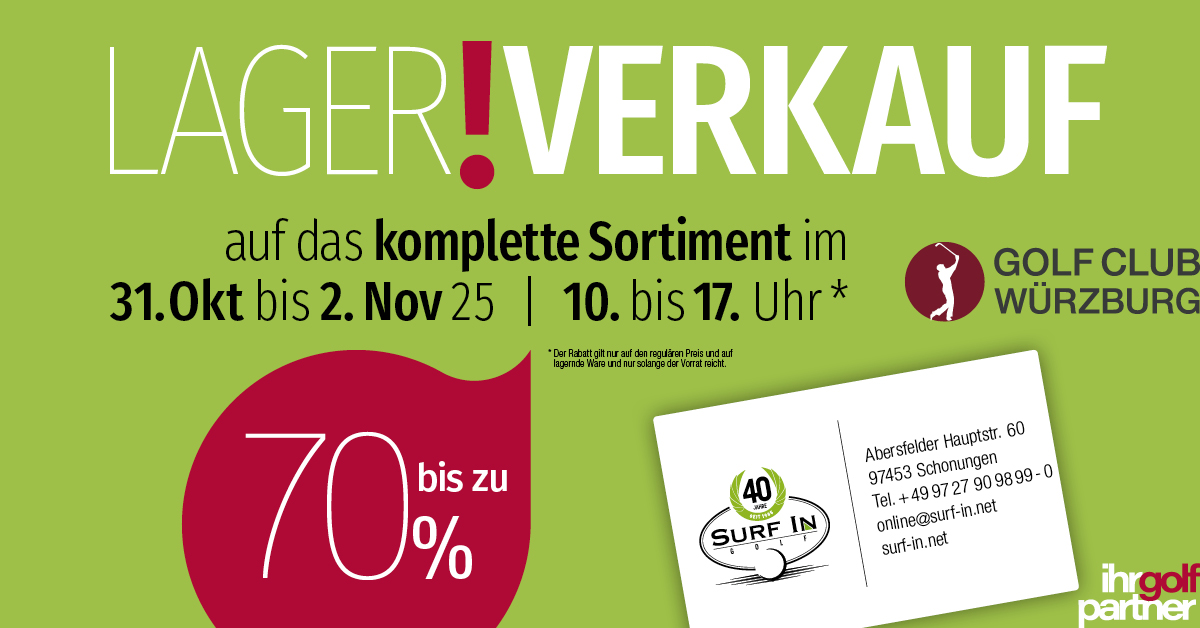 Großer Lagerverkauf von 31.10. bis 02.11.2025 im Golf Club Würzburg