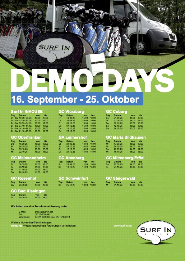 Zu den Service & Beratungstagen steht Ihnen unser Shop-Partner Surf In persönlich mit besonderen Top-Angeboten und noch größerer Auswahl zur Verfügung. Bei den regelmäßig stattfindenden Terminen ist eine individuelle Schlägeranpassung jederzeit möglich.