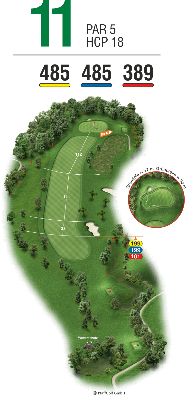 Mit Index 18 gilt Bahn 11 als das vermeintlich leichteste Loch auf der Anlage. Ein Fairwaybunker lauert auf der rechten Seite der Drive-Landezone. Ab ca. 120 Meter vor dem Grün können die Hecke links oder das trockene Wasserhindernis rechts zum Problem werden.