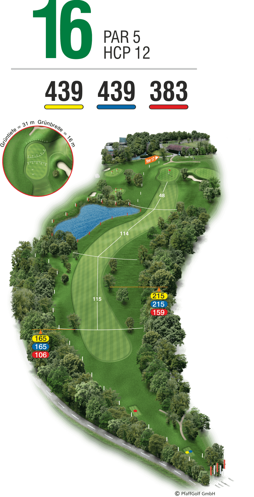 Das Par 5-Loch hat es trotz nur geringer Länge durchaus in sich. Es verlangt von den Herren einen nahezu blinden Abschlag. Beim zweiten Schlag kommt das Wasser auf der linken Seite voll ins Spiel und das Grün gehört zu den anspruchvollsten Putt-Parcours auf der Anlage.