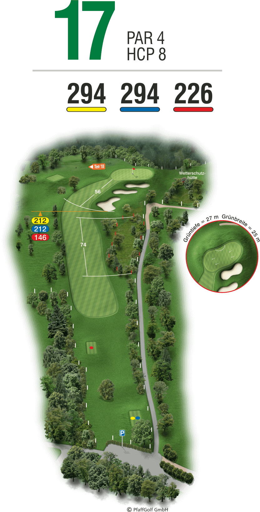 Das relativ kurze Par 4 verlangt nach einem sehr präzisen Abschlag und einem nicht minder hochwertigen zweiten Hieb. Das Grün wird schon ab ca. 70 Meter vor dem Grün von drei Bunkern schwer bewacht. Eine zusätzliche Schwierigkeit ist das Wasserhindernis rechts und das Feld links.