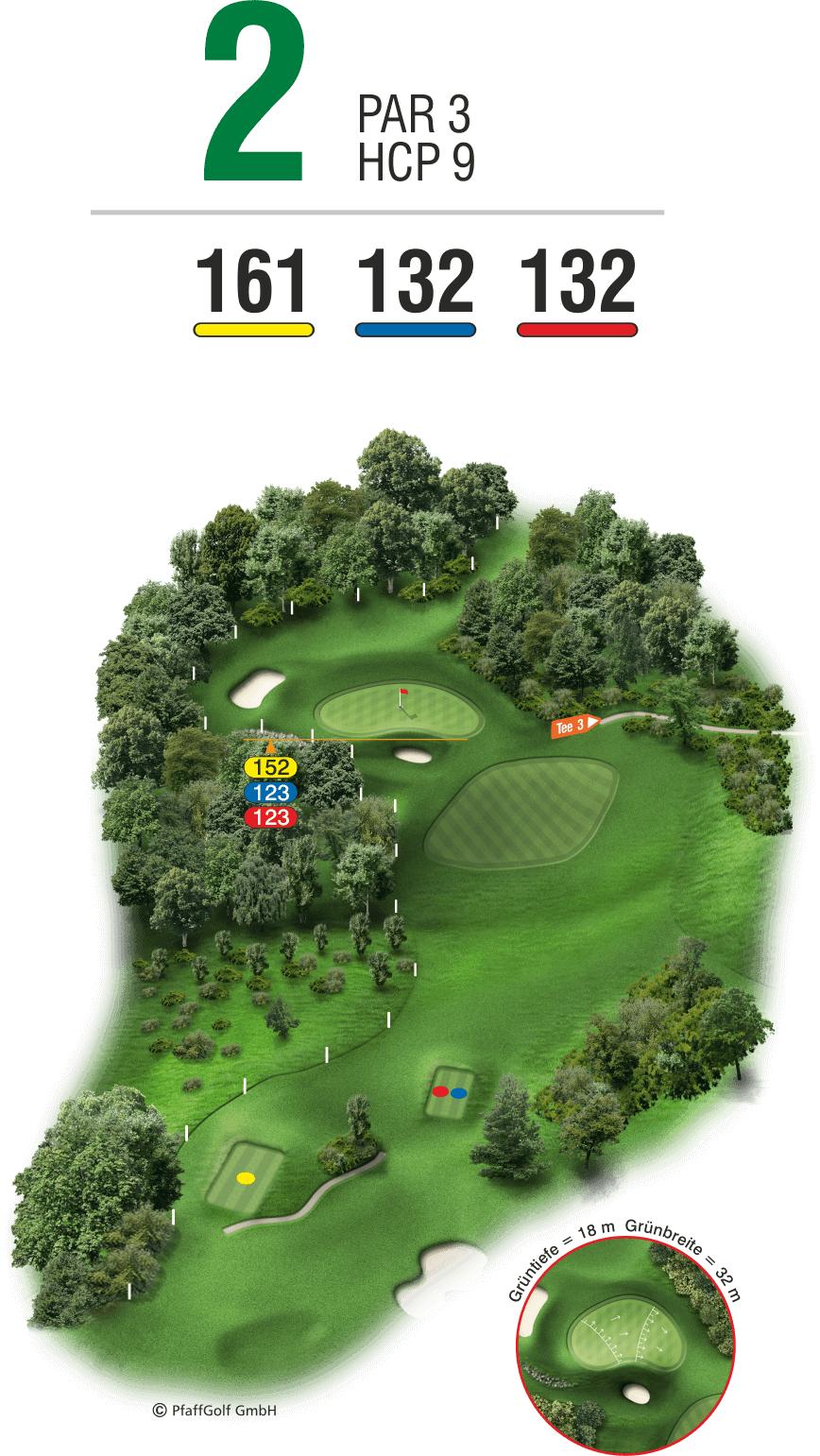 Halten Sie sich an die rechte Seite, sofern Sie keinen sicheren Schlag ins Grün haben. Achten Sie auf den Wind und nehmen Sie im Zweifelsfall nur dann einen Schläger mehr, wenn Ihr „schlechter Schlag“ nicht dramatisch nach rechts wegfliegt. Dann droht der Ball in der Hecke zwischen Weg und Vorgrün zu verschwinden.