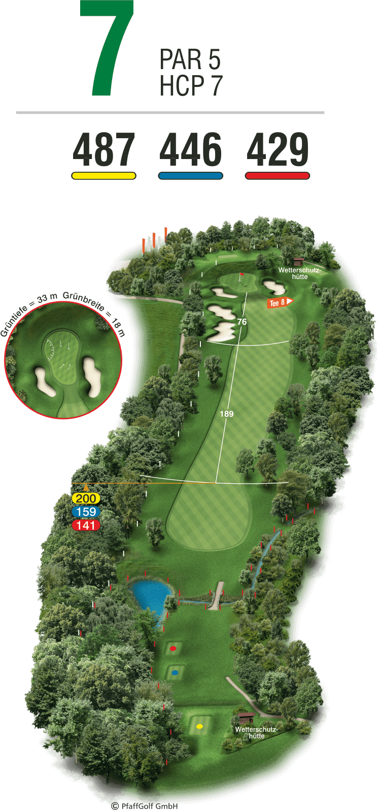 Das längste Par 5 auf der Anlage weist einiges an Steigung auf und spielt sich deshalb eher wie ein 500 Meter-Loch. Das Fairway hängt anfangs deutlich von rechts nach links, weshalb viele Abschläge vom Fairway ins linke Rough verspringen.