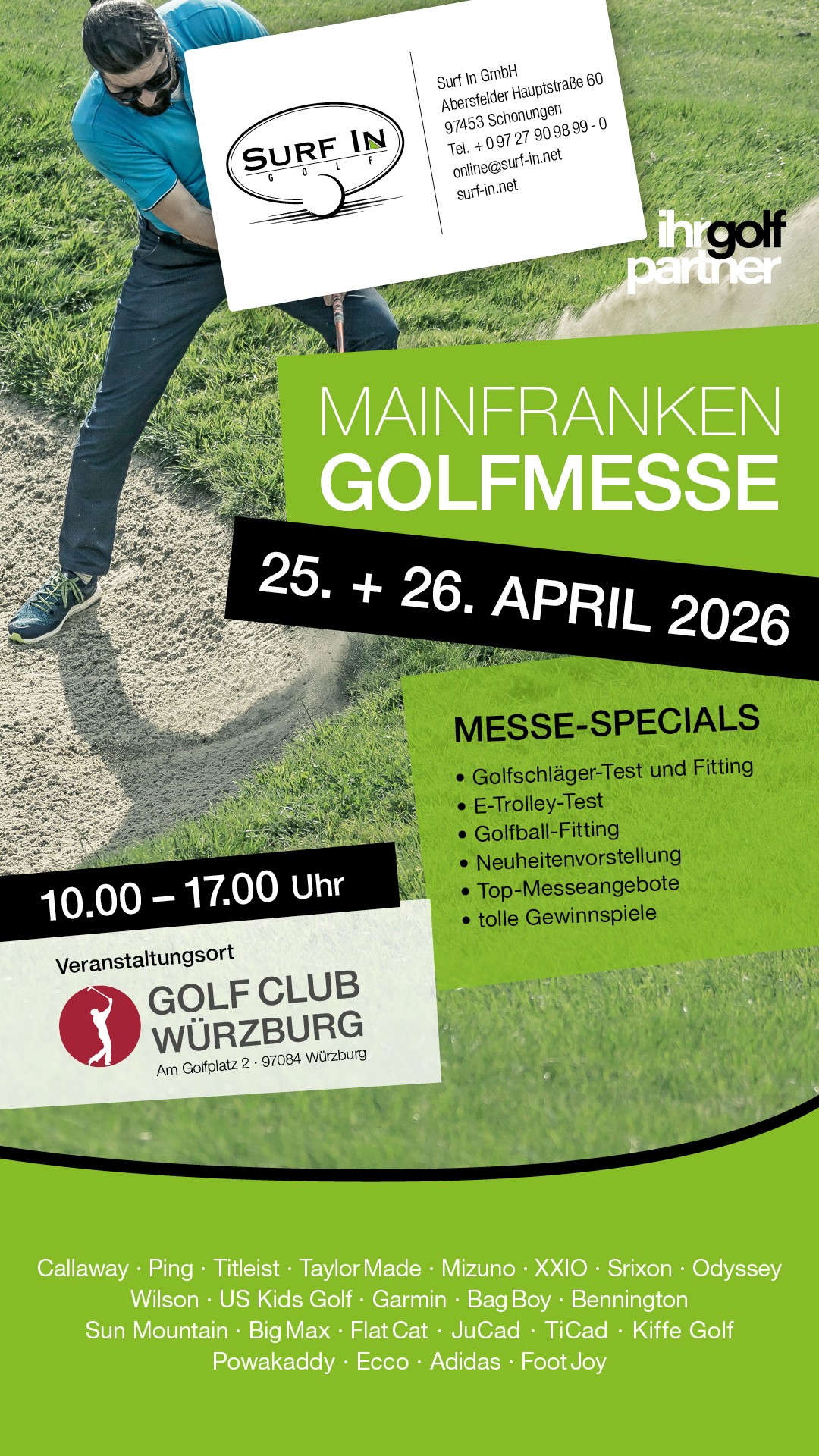 Am 25. und 26. April 2026 verwandelt sich der Golf Club Würzburg in das Zentrum der Golfszene in Mainfranken. Die Mainfranken Golfmesse von unserem Golfshop-Partner SURF IN bringt führende Marken, neueste Technologien und echte Messe-Highlights direkt auf unsere Anlage – ein Event, das Golferinnen und Golfer aller Spielstärken begeistern wird. Ob ambitionierter Turnierspieler, Freizeitgolfer oder Einsteiger – an diesem Wochenende dreht sich alles um Performance, Technik, Trends und die Faszination Golf.