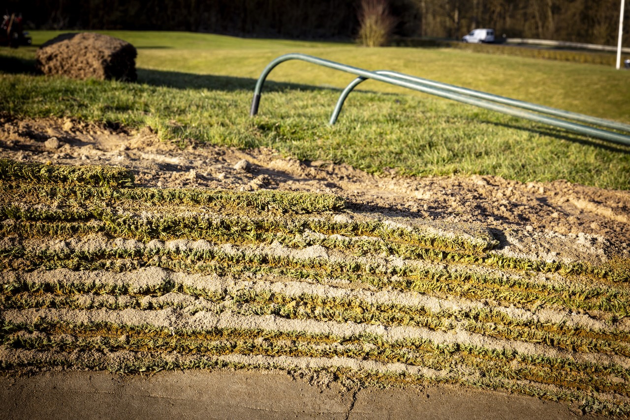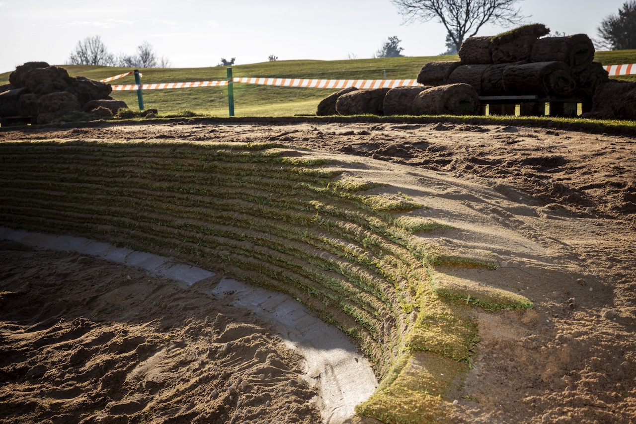 Vielleicht wundern Sie sich über die aktuell noch überhängenden Grassoden am oberen Rand des Bunkers. Diese bleiben bewusst so lange stehen, bis die oberste Naturrasenschicht vollständig mit dem Untergrund verwachsen ist.