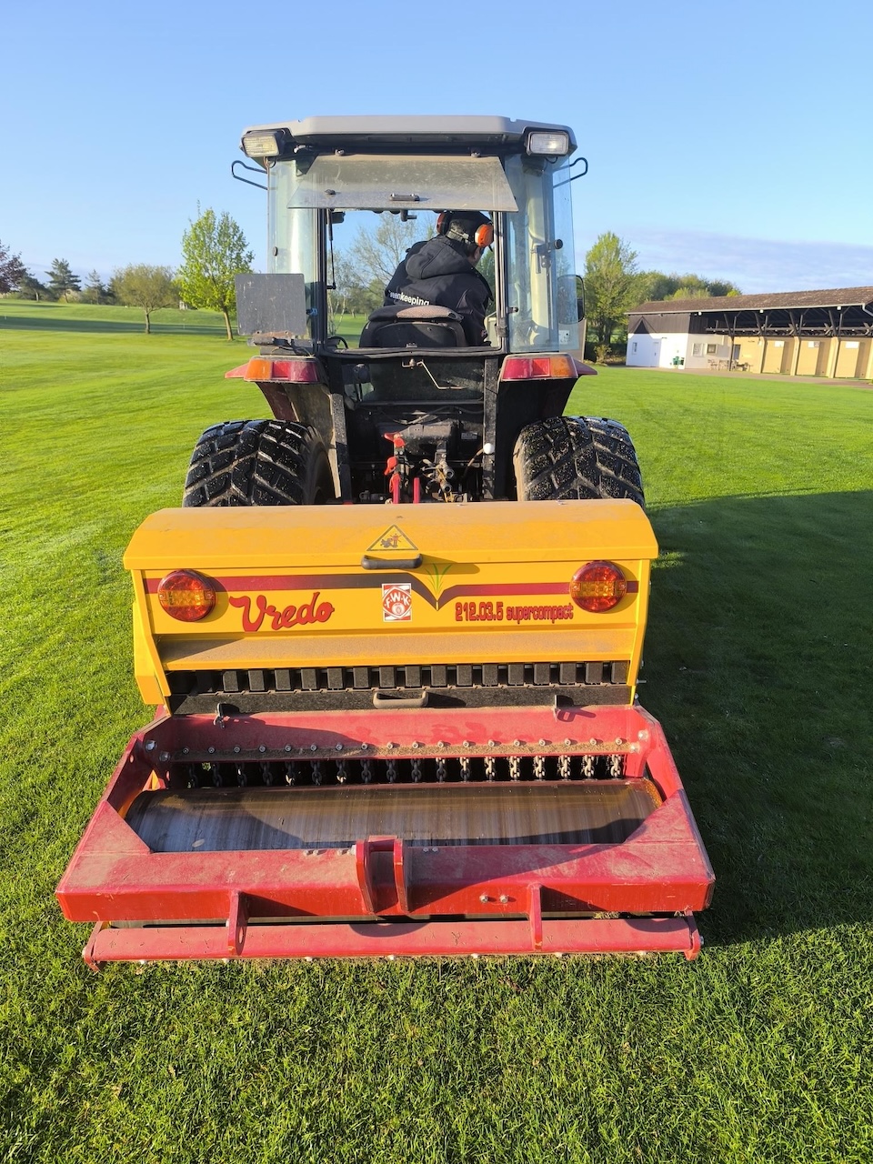 In der vergangenen Saison sind durch die intensive Nutzung Lücken entstanden, die sich bis heute nicht vollständig geschlossen haben. Aus diesem Grund haben wir eine gezielte Nachsaat durchgeführt, um diese Bereiche nachhaltig zu regenerieren und die Qualität der Rasenflächen zu verbessern. Dabei kam die Vredo Schlitznachsaat zum Einsatz: Scharfe Schneidscheiben öffnen die Grasnarbe präzise und bringen das Saatgut direkt in der optimalen Tiefe in den Boden ein. Dieses Verfahren sorgt für einen besonders guten Bodenschluss und fördert eine schnelle und gleichmäßige Keimung.