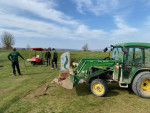 Um die Abschlagsfläche am Damen – Tee der Bahn 4 wieder eben zu gestalten, wurde die oberste Rasentragschicht mit dem Sodenschneider abgesodet, aufgerollt und neben dem Abschlag zwischengelagert.