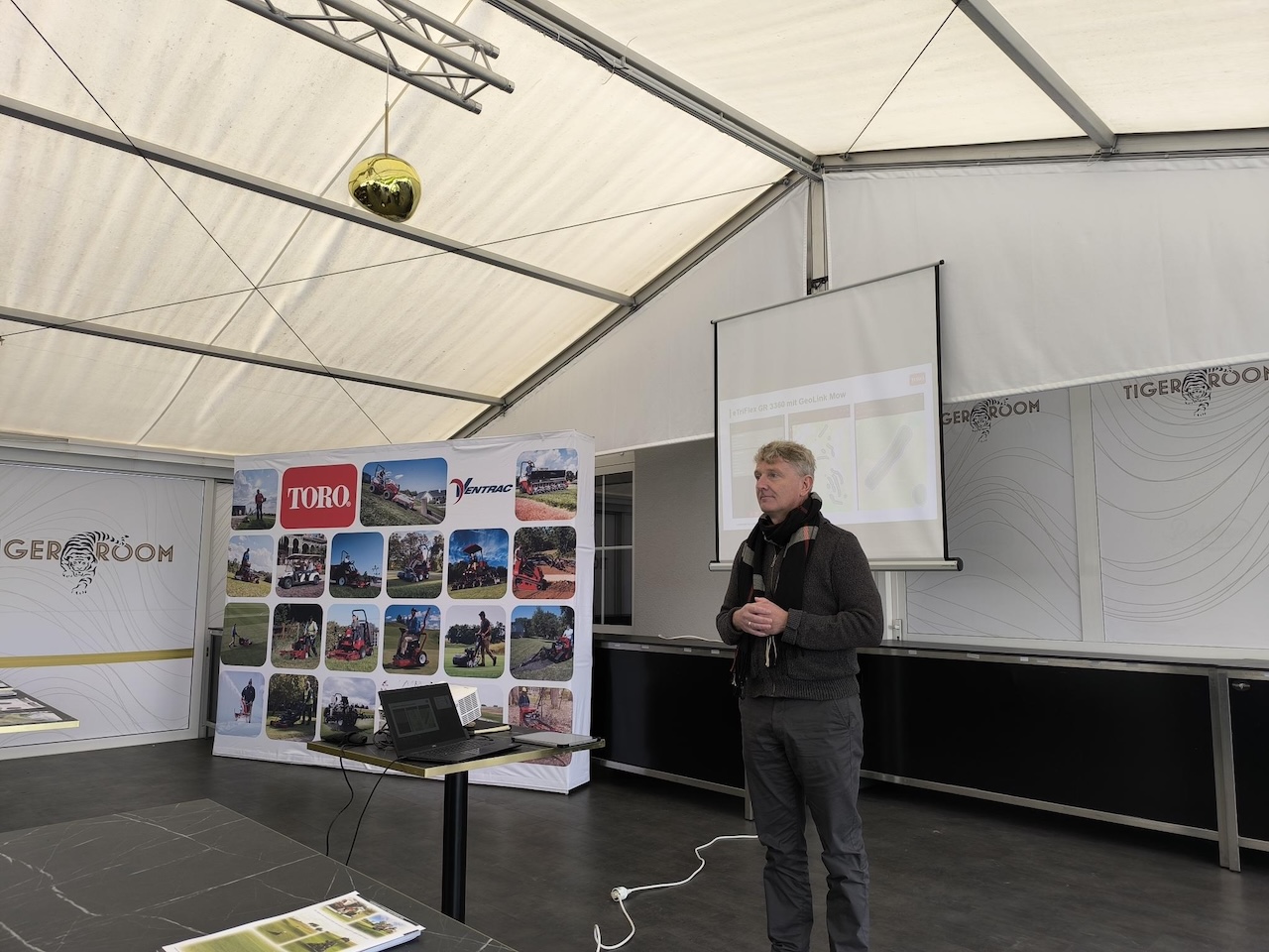 Christoph Rehbronn gab eine kurze Einführung in die Technik der Maschine. Danach folgte der Praxiseinsatz – der Höhepunkt des Tages. Toro hatte den Golfplatz Würzburg bereits im Vorfeld für einen mehrwöchigen Test ausgewählt, um die Maschine unter den anspruchsvollen Bedingungen der Golfanlage zu prüfen.