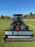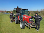 Dazu wurde unser Maschinenpark extra um ein neues Gerät erweitert, welches im Abstand von etwa 4 cm Schlitze in den Boden fräst und frisches Saatgut direkt in diesen Schlitzen ablegt. Das hat den Vorteil, dass die Samen ideale Keimungsbedingungen vorfinden und gerade in den besonders trockengestressten Bereichen die Auflaufrate mehr als verdoppelt werden kann. Das führt langfristig zu einer Verjüngung des Rasenbestandes und dadurch zu einer höheren Widerstandsfähigkeit gegen jeglichen Stress in der Pflanze.