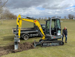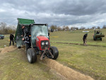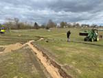 Um auf der Abschlagsfläche der Driving Range möglichst durchgehend eine geschlossene Rasendecke zu haben, müssen die herausgeschlagenen Divots 1 -2 mal wöchentlich nachgesät werden. Eine schnellstmögliche Keimung der Grasfrüchte wird nur erreicht, wenn diese Fläche immer feucht gehalten wird. Der Untergrund dieser Trainingsfläche ist aber meist nicht vollständig von gleicher Beschaffenheit. An manchen Stellen besteht der Boden z. B. aus wasserundurchlässigem Ton und somit entsteht hier mit der Zeit Staunässe und an der Oberfläche bilden sich Pfützen. Staunässe kann sich auch witterungsbedingt bilden, wenn in der kalten Jahreszeit Schnee liegt oder es oft regnet. Aus diesem Grund hat unser Greenkeeper Team jetzt, nachdem die Nachtfröste für dieses Frühjahr hoffentlich der Vergangenheit angehören und der Boden von der Nässe aufgeweicht ist, mit dem Bagger auf dem Trainingsgelände Gräben gezogen. In diese wurden Drainage-Rohre eingebracht, um das überschüssige Wasser aufzufangen und von der Driving Range abzuleiten. Ein zügiges Gräserwachstum durch steigende Temperaturen vorausgesetzt, werden die oberirdischen Spuren dieser Arbeiten bald nicht mehr zu sehen sein. Golferinnen und Golfer erwarten dann bald weiter verbesserte Trainingsmöglichkeiten.